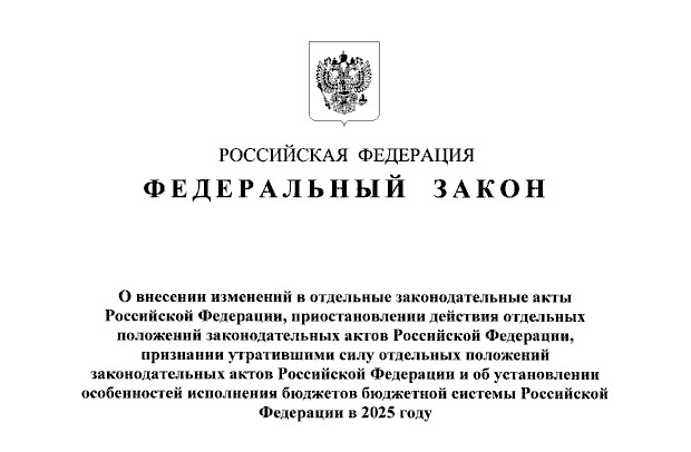 Президентом России Владимиром Путиным подписан закон, который устанавливает особенности исполнения бюджетов бюджетной системы РФ в 2025 году и приостанавливает действие некоторых норм Бюджетного кодекса РФ. Он также вносит изменения в некоторые законодательные акты Российской Федерации.