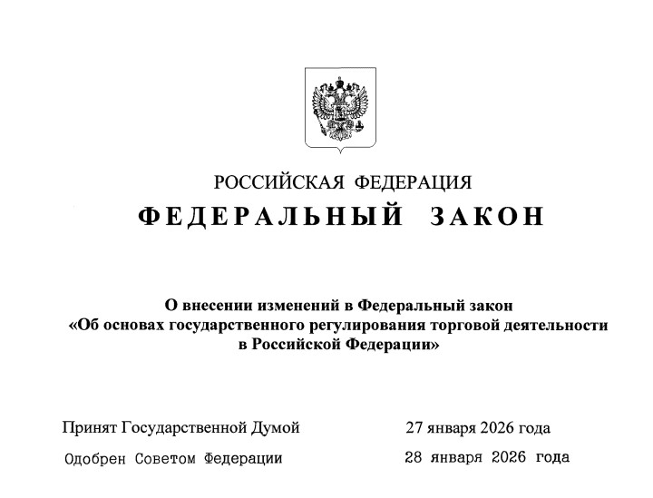 На официальном интернет-портале правовой информации опубликован Федеральный закон от 30.01.2026 № 14-ФЗ «О внесении изменений в Федеральный закон «Об основах государственного регулирования торговой деятельности в Российской Федерации», который вводит важные изменения в регулирование торговой деятельности в России.